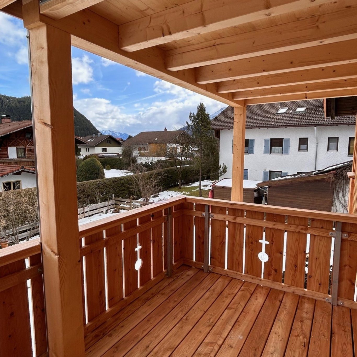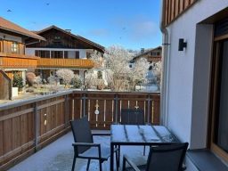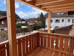 Die Ferienwohnung Bergkiefer befindet sich im Dachgeschoss und verfügt über einen großen Balkon mit Panoramablick bis zur Zugspitze.