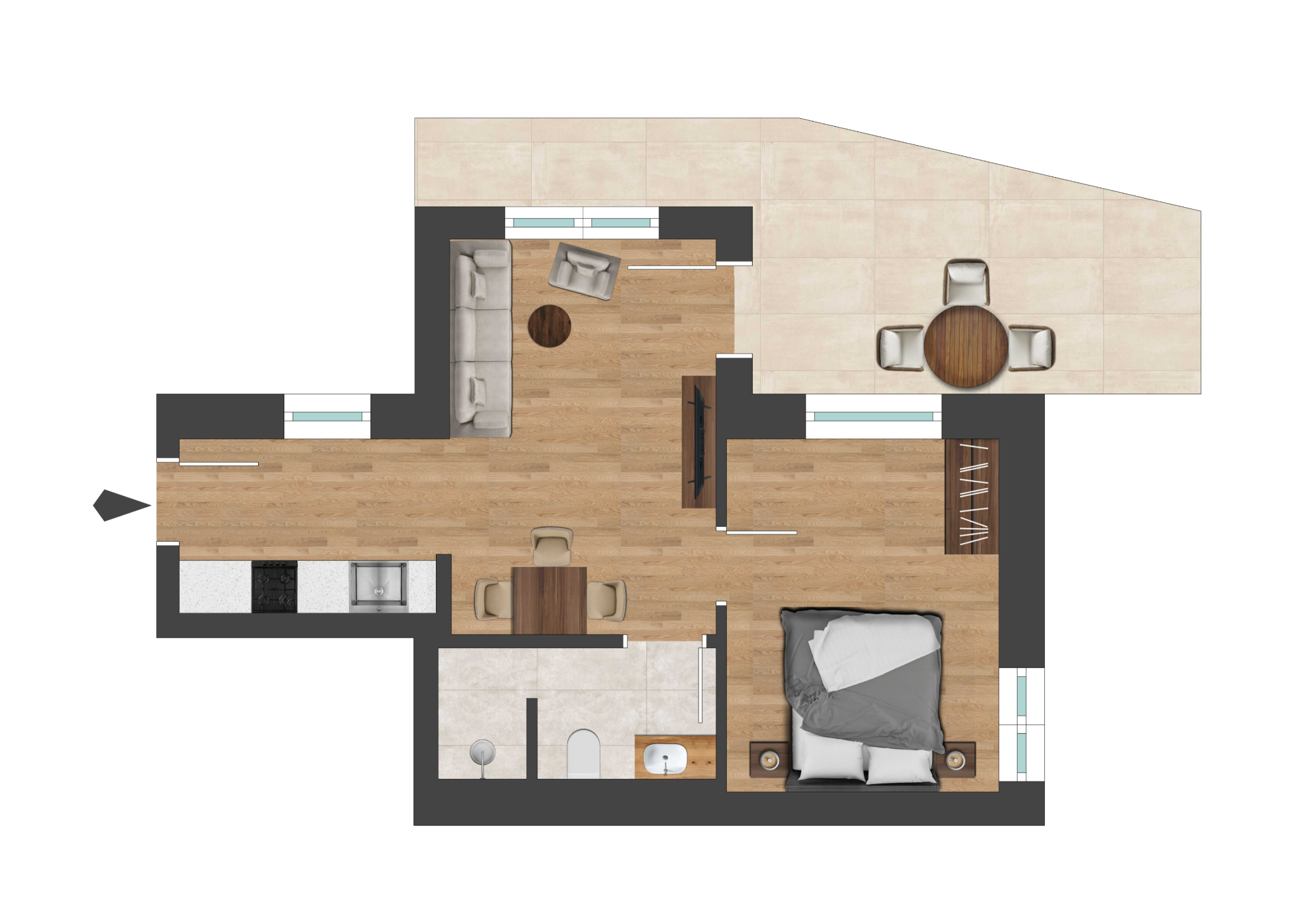49 qm, Wohnbereich, Schlafzimmer, Duschbad, Gartenterrasse
